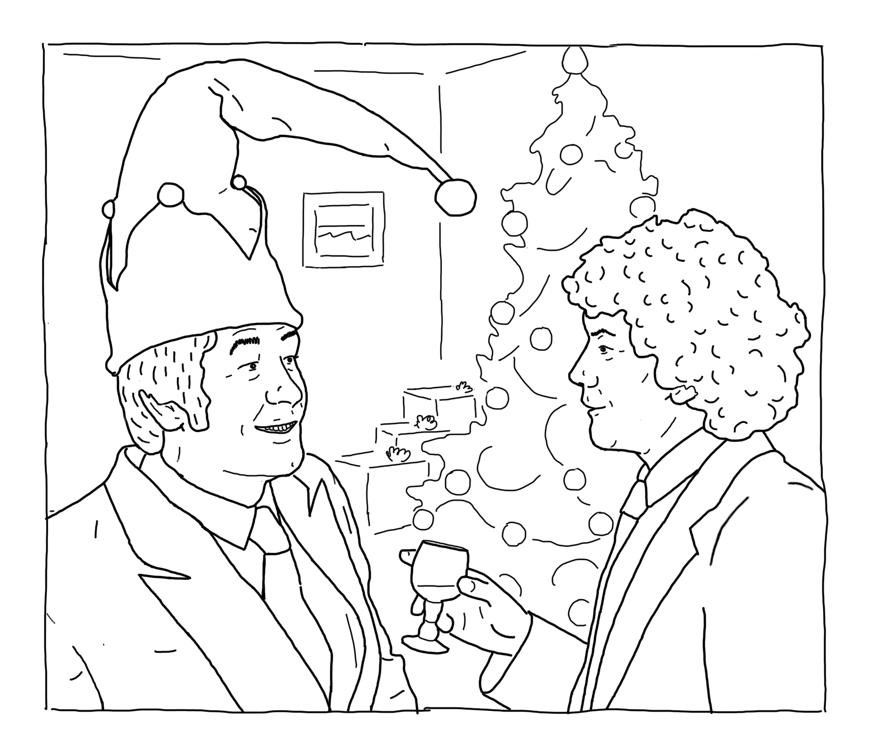 (click to embiggen)Ho ho ho! My contribution today is this Pros Christmas coloring page, which I created by making a rough photo manipulation then tracing it by hand with my digital pen and tablet.